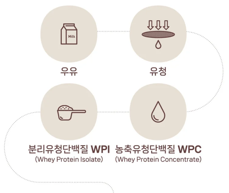 WPC(농축유청단백질)는 단백질 순도 70-80%, 유당 4-8%로 경제적이지만 소화 부담이 있을 수 있어요.
